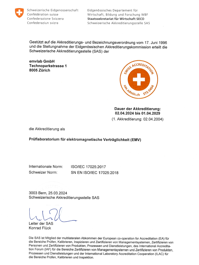 Wir sind ein unabhängiges Prüflabor für EMV und Funk, akkreditiert durch die Schweizerische Akkreditierungsstelle (SAS) als: Prüflaboratorium für elektromagnetische Verträglichkeit EMV.ISO / IEC 17025SN EN ISO / IEC 17025Wir verfügen über die geforderten Räumlichkeiten und Einrichtungen im Technologie und Innovations Hotspot in Zürich. Unsere Mitarbeiter haben langjährige praktische Erfahrung, das geforderte Fachwissen und bilden sich in den betreffenden Fachgebieten ständig weiter. Akkreditierung bedeutet die formelle Anerkennung der fachlichen und organisatorischen Kompetenz einer Stelle, eine konkrete, im Geltungsbereich der Akkreditierung beschriebene Dienstleistung durchzuführen. Kompetenz ist der Schlüssel zu Transparenz, Vertrauen und Vergleichbarkeit.